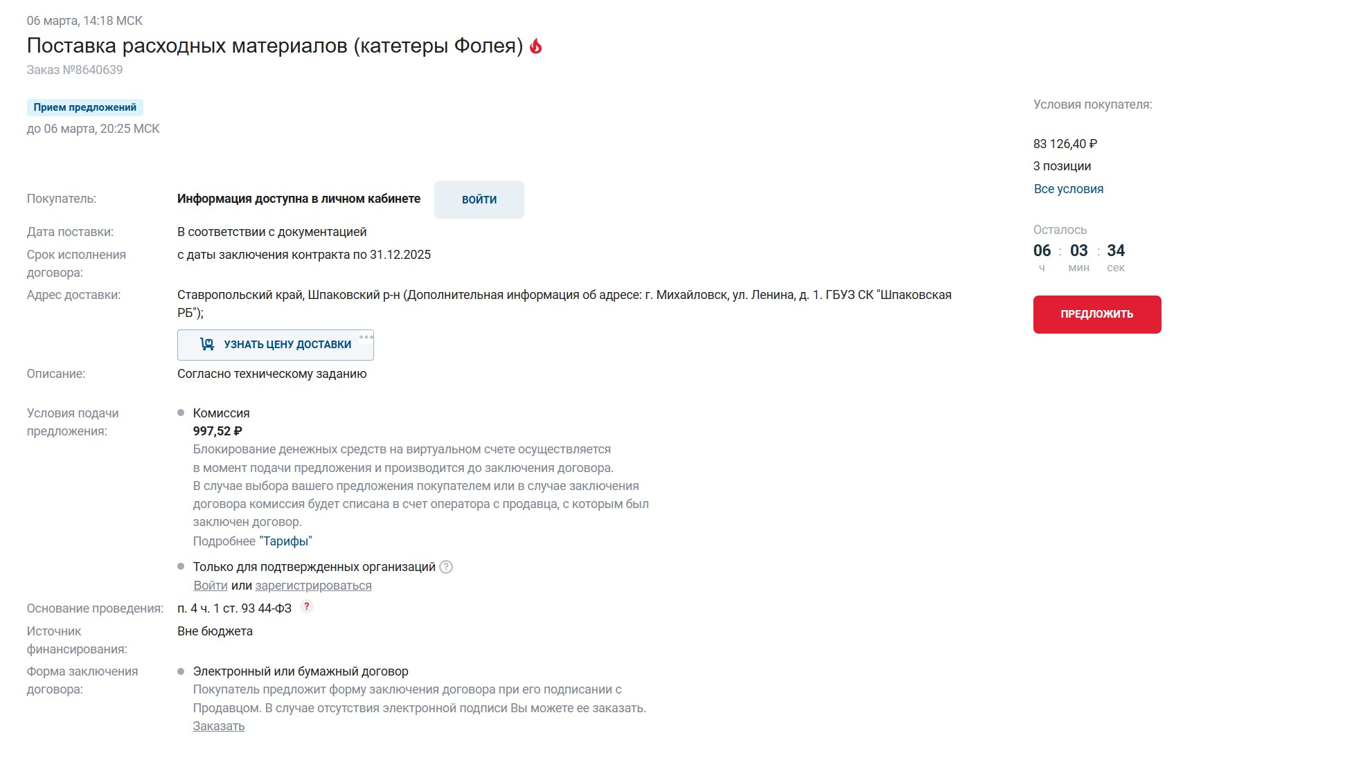 Пользователи, прошедшие регистрацию, могут получить доступ к карточке интересующего лота. В ней содержится информация о заказчике, требованиях, а также документация.