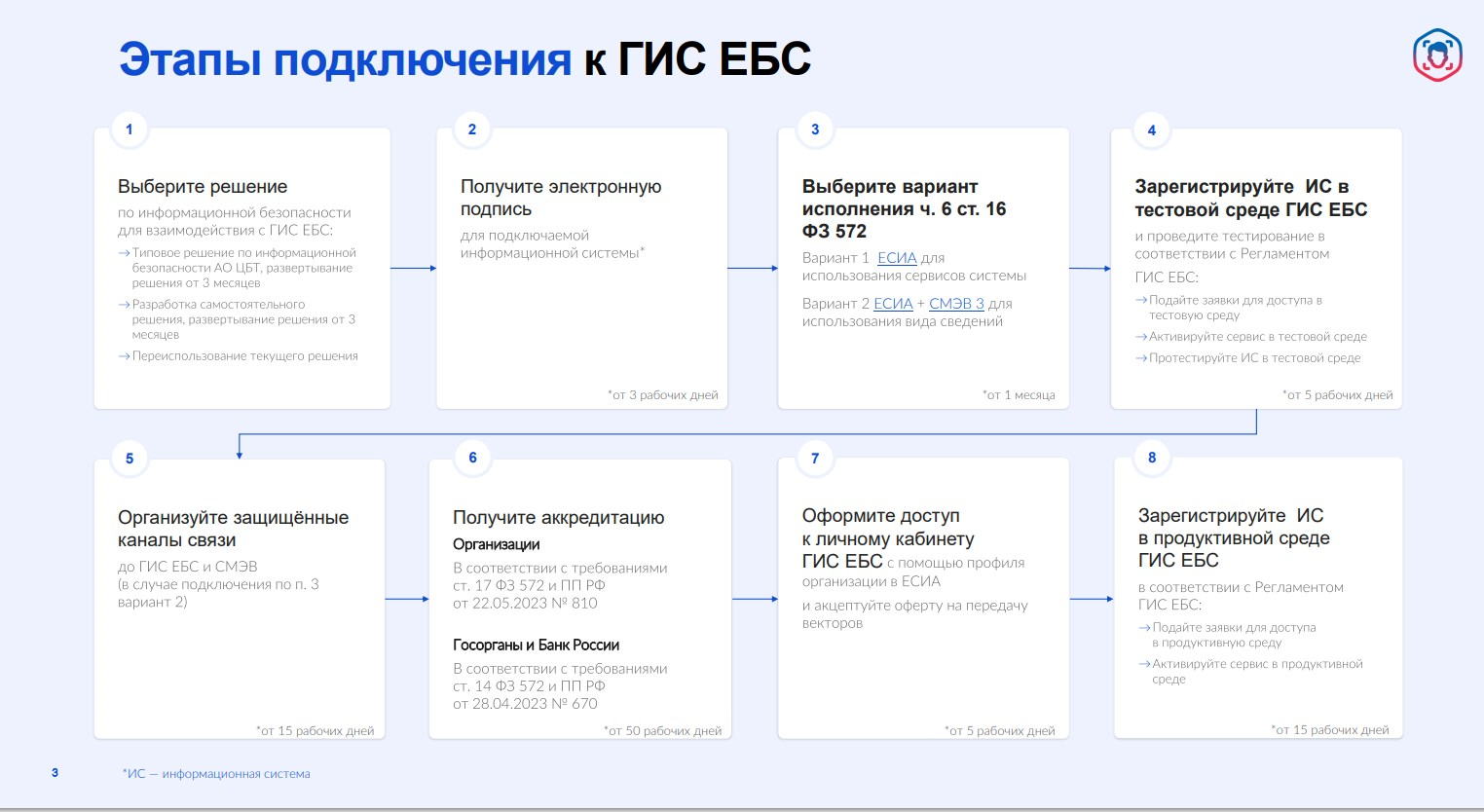 Для обеспечения регистрации биометрии организация должна настроить подключение к продуктивным ЕСИА, ЕБС, СМЭВ, выполнив требования и условия межсистемного взаимодействия. Кроме того, необходимо будет подключить офисы обслуживания, организовать рабочие места (ПК), закупить и установить для них оборудование и программное обеспечение, выполнить настройки и протестировать работу.
